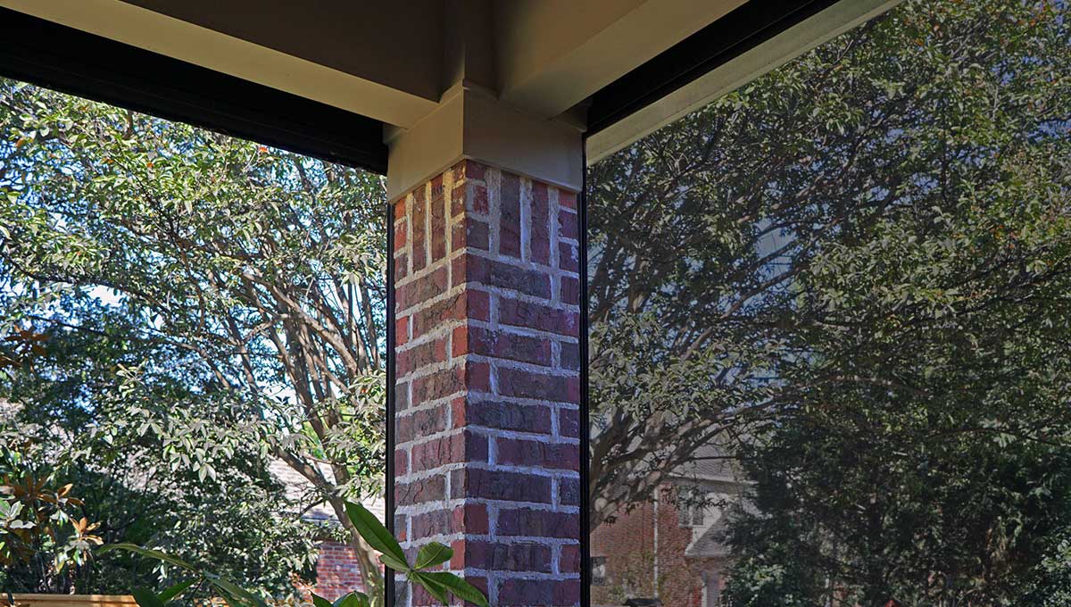 A new hip roof was installed over the porch to allow additional light into the interior. Pella Architectural Series windows and a door were added, providing direct access to the Great Room and its 20-ft ceiling. Custom cast stone pillars and crown molding were fabricated by Stone Legends of Dallas, Texas. Copper guttering and a new concrete tile roof were added to complete the transformation of the porch from boring to beautiful.